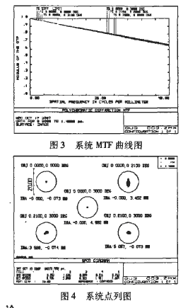 此光学系统对波长0.8μm,1.1μm,1.4μm的M吓曲线如图3所示,对应点列图如图4所示。可以看出其调制传递函数已经接近衍射极限,点列图也较理想。