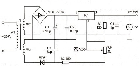 稳压输出电路由三端可调稳压集成电路IC及电阻器RI、电位器RP、电容器C4和电压表PV组成。实际应用时,IC选用LM317型三端可调稳压集成电路;RP选用合成膜电位器;PV选用0~50V直流电压表。
