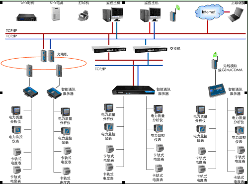 通过对工业企业内部的主要电器设备,如变压器、电机(如泵、风机、空压机)、照明设备、电缆、电热设备、整流设备、空调制冷设备等电器及整个配电系统,采用智能电工仪器进行实时监测,采集设备与系统的电流、温度、功率、功率因素、有功电度、无功电度等用电信息,建立工业企业电能平衡信息管理系统。系统拓扑结构如下: